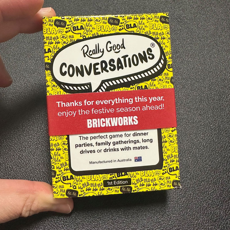 In the world of corporate engagement and networking, leaving a lasting impression is paramount. We offer unique co-branded opportunities to add your logo, slogan or a tailored message to packs of Really Good Conversations as corporate gifts for staff and clients alike.