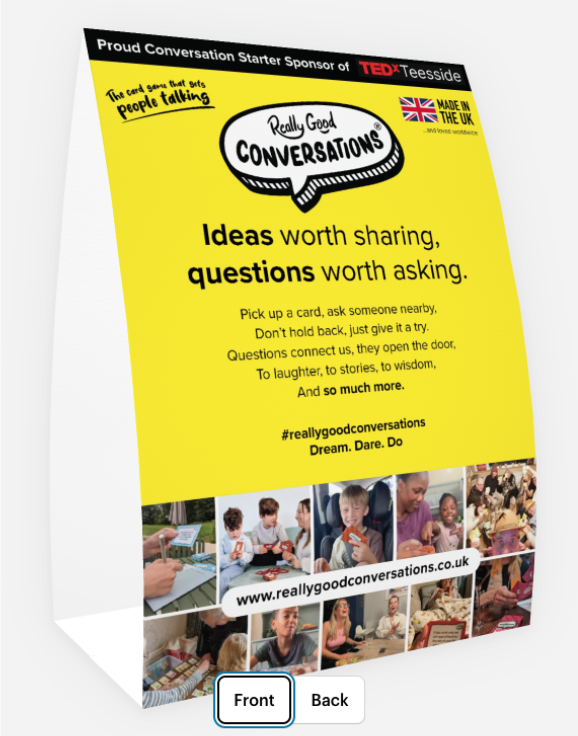 We partnered with TEDxTeesside as their Official Conversation Starter Sponsor, providing co-branded cards and activations across their pre-event dinner, a dedicated Conversation Zone on the day, and exclusive attendee discounts. Our co-branded tent cards helped set the tone for an event built around ideas worth sharing.
